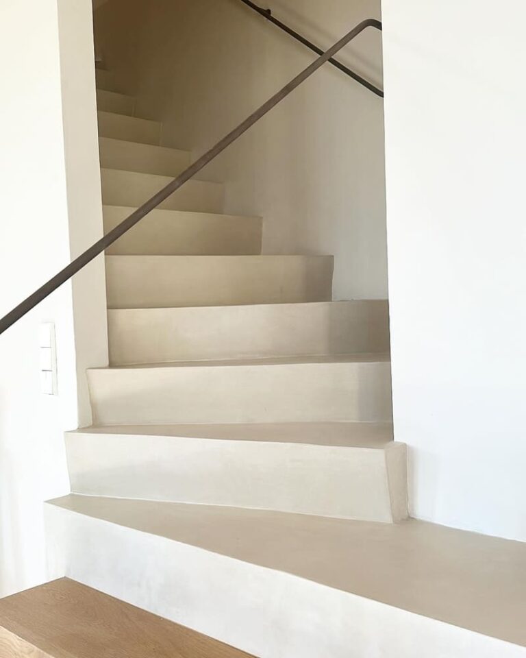 Rénovation de la salle de bain de ce mas provençal. Préparation des supports et application d’un enduit béton ciré teinte Corde de chez Marius Aurenti. Rénovation de l’escalier en béton ciré teinte Corde de chez Marius Aurenti. Application de béton ciré sur deux banquettes du coin séjour, teinte Corde de chez Marius Aurenti.